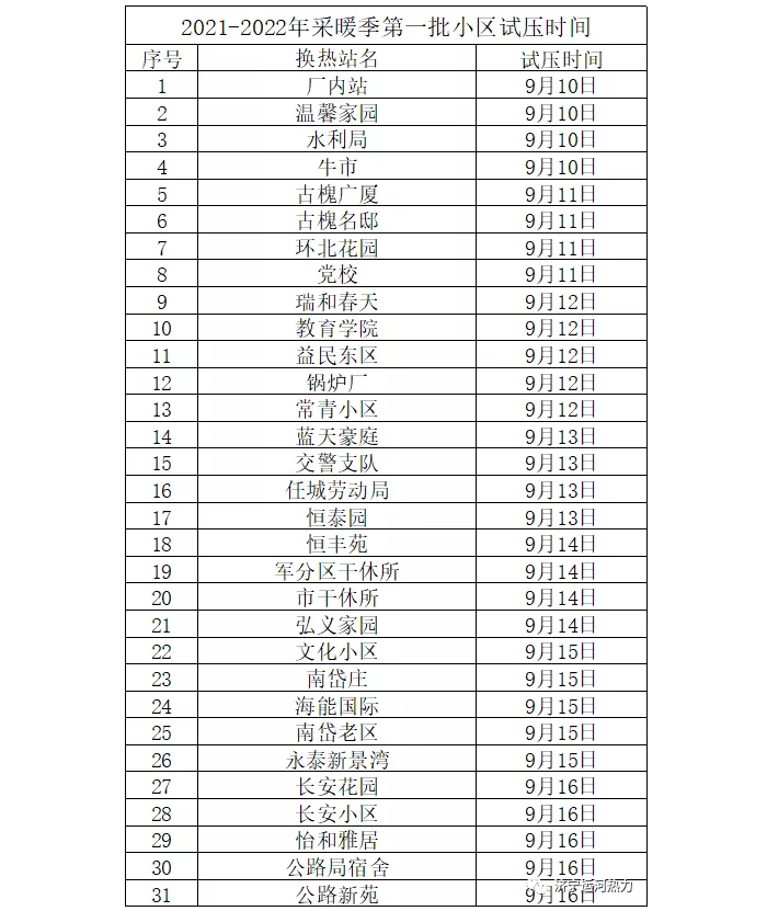 濟(jì)寧運(yùn)河熱力有限公司 2021-2022年采暖季第 一批小區(qū)試壓通知