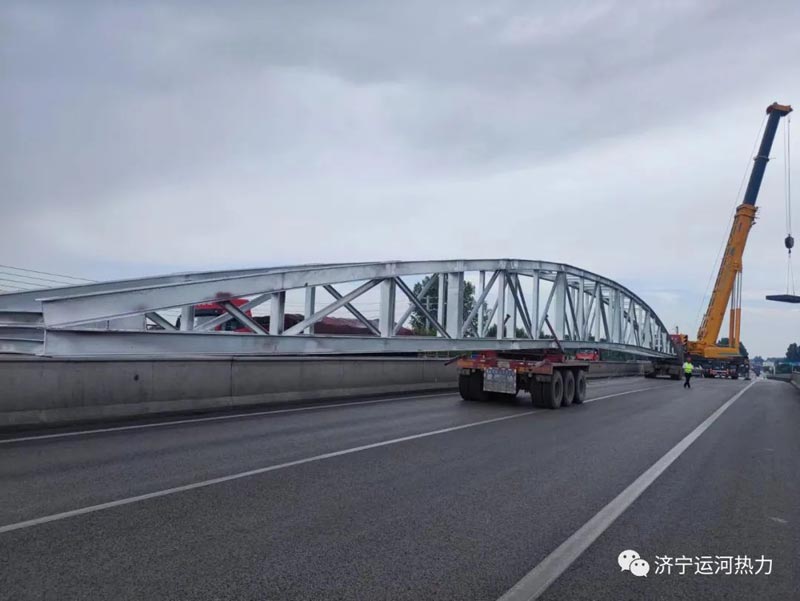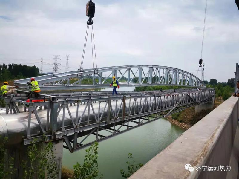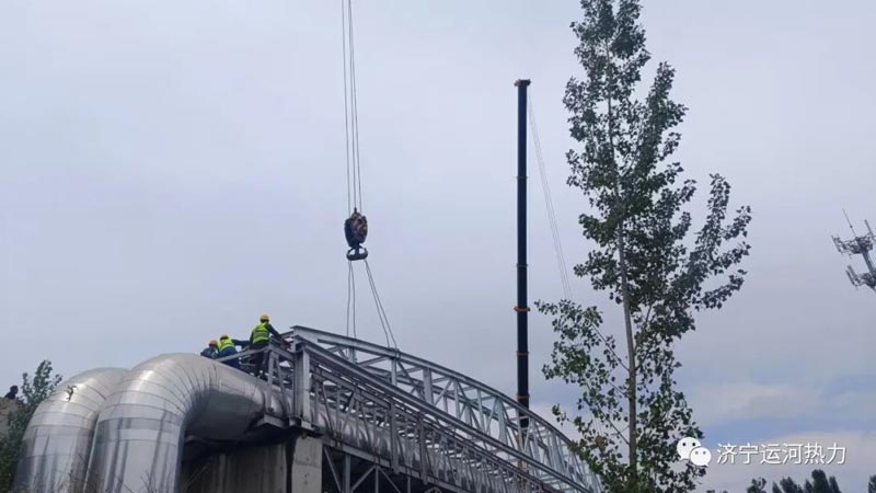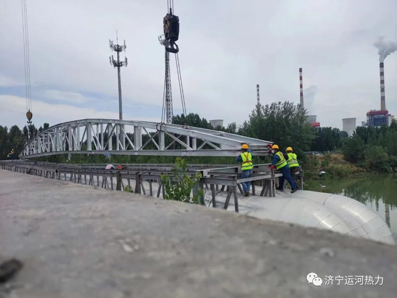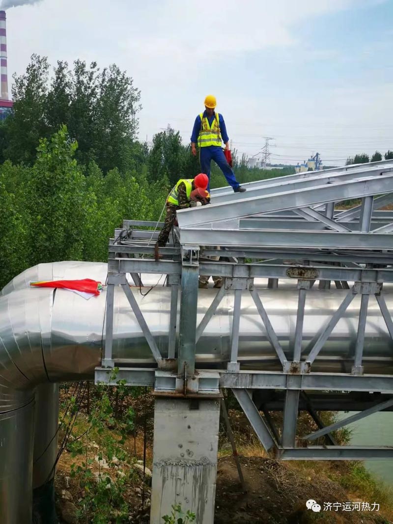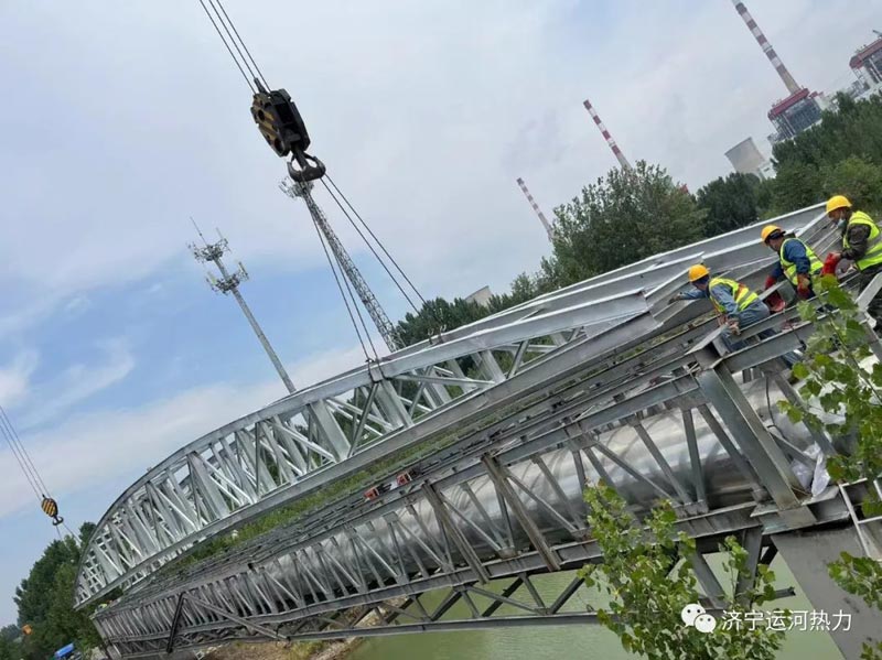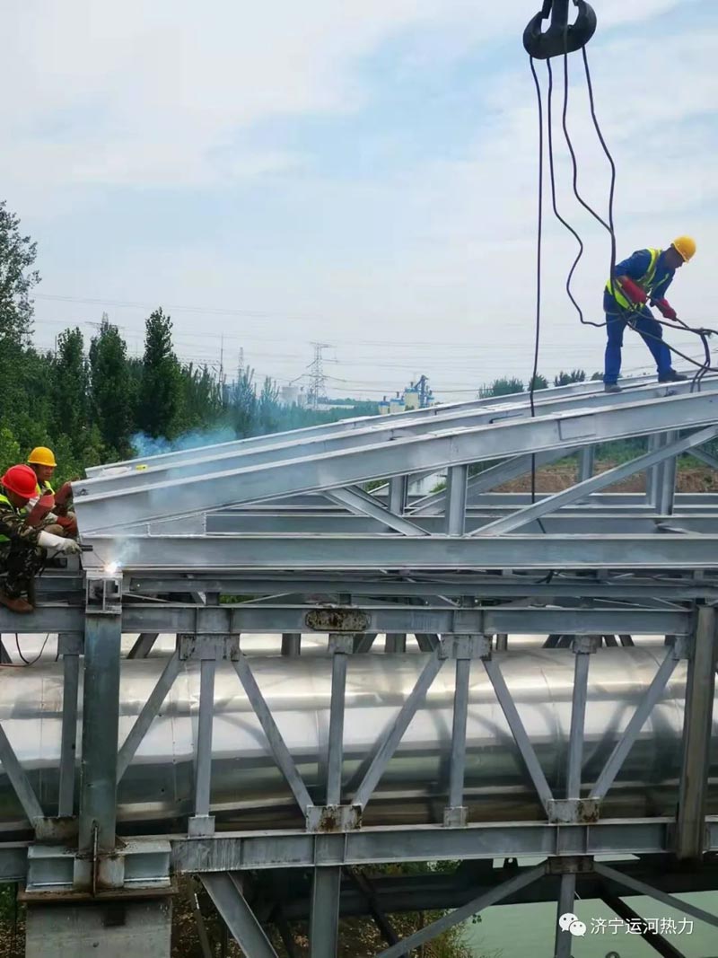隨著(zhù)指揮員的一聲哨響,2022年6月14日11點(diǎn)19分,兩部碩大的吊車(chē)緩緩放下鋼索,跨度為51米的跨河供熱主管網(wǎng)加固支架順利吊裝完成,這標志著(zhù)濟寧運河熱力有限公司的跨河DN1200的供熱主管網(wǎng)的安全隱患徹底消除,同時(shí)也為濟寧內陸主城港區航道的升級改造掃除了卡脖子工程。
